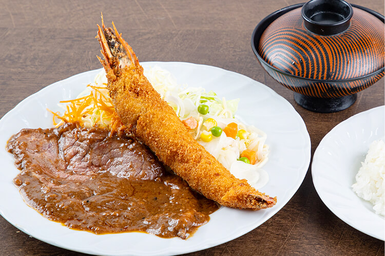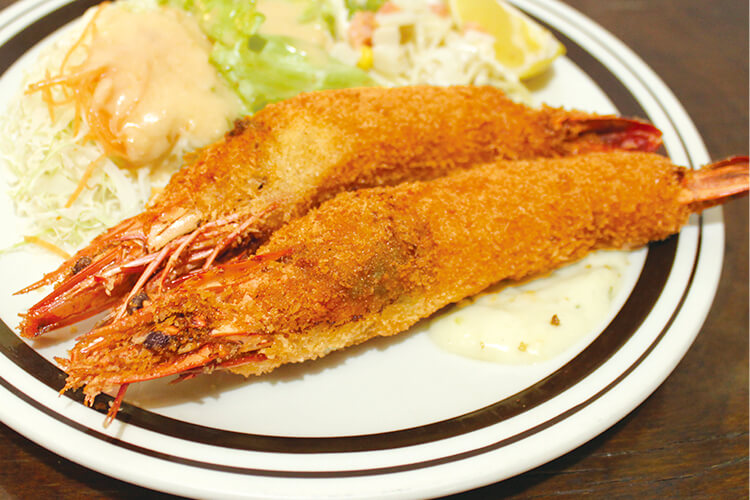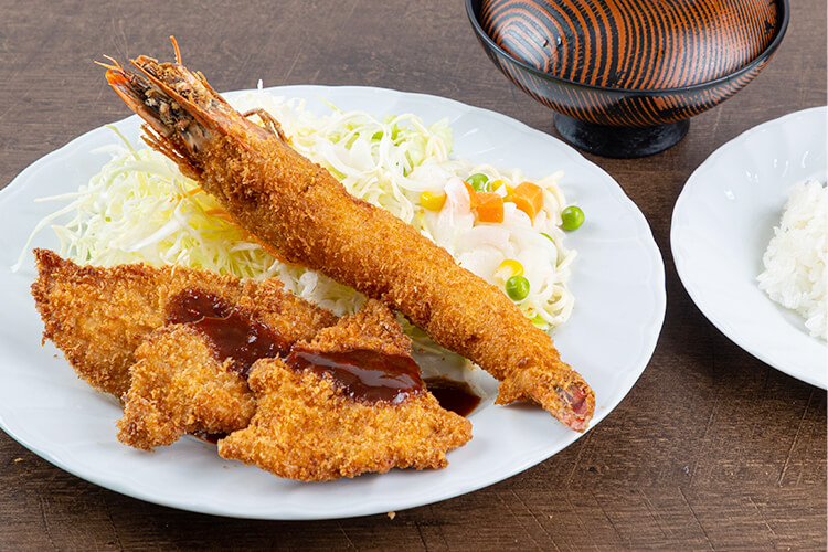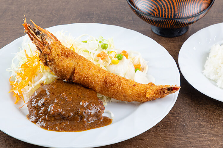当店自慢の大きなエビフライは、外側はサクッとカリッと、中はふわっとジューシーに仕上げています。